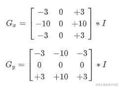 注意:当内核大小为3时, 以上Sobel内核可能产生比较明显的误差, 为解决这一问题,我们使用Scharr函数,但该函数仅作用于大小为3的内核。该函数的运算与Sobel函数一样快,但结果却更加精确,其计算方法为: