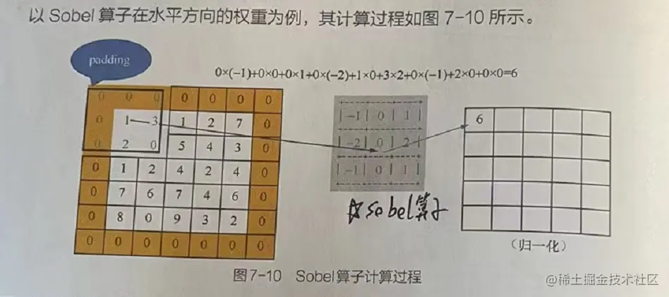 Sobel算子计算过程图7-10左边的5×5浅色矩阵可以理解为原始图片。中间的3x3矩阵便是Sobe1算子。图7-10右边的5×5矩阵可以理解的轮廓图片。