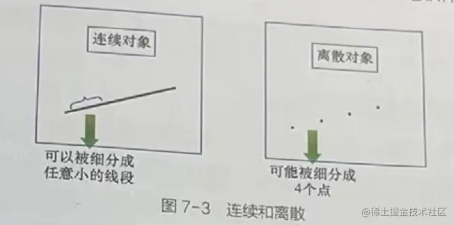 将离散的对象进行细分的过程,称为离散微分,例如图7-3右,虚线段分成四个点的过程。