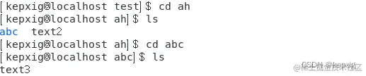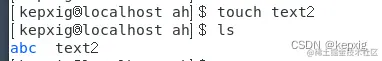 4.进入到(ah)子目录中,再新建一个子目录(abc),同时建立空文件text2