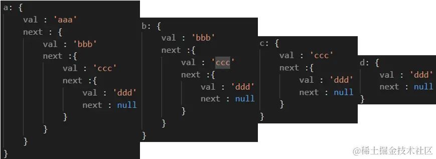 const a = { val: 'aaa' } const b = { val: 'bbb' } const c = { val: 'ccc' } const d = { val: 'ddd' } a.next = b b.next = c c.next = d- 遍历