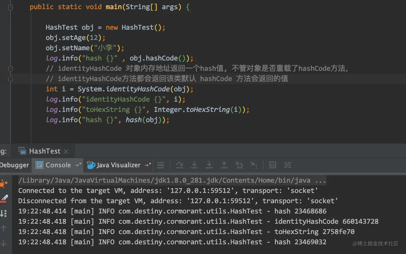 HashTest 类重写了 hashCode 方法,hashCode 方法需要计算每个属性的 hashCode 值,进行累加。identityHashCode 方法返回的是对象地址的hash值,不论是否重写 hashCode 方法都不会改变其值。