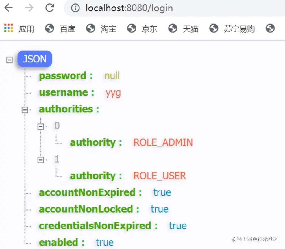 在认证成功后,Spring Security会把认证的用户信息以JSON格式展示出来,比如我们的用户名、密码、角色等信息。