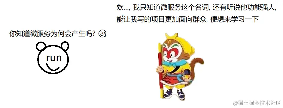 刚进这个国家, 一片片热浪就打在悟空的身上, 一会儿衣服就变得湿皱皱的了, 想起来此地的目的,便顾不得抱怨, 找了个路人甲问了微服务的学法, 那人倒也胆肥,见猴子般模样的人竟也不怕,反而介绍起了自己来, 张口说着,我是run, 是一名不断探索java这条大路的冒险者,听你说要学习java的微服务, 那就没找错人了, 我来给你说上一番