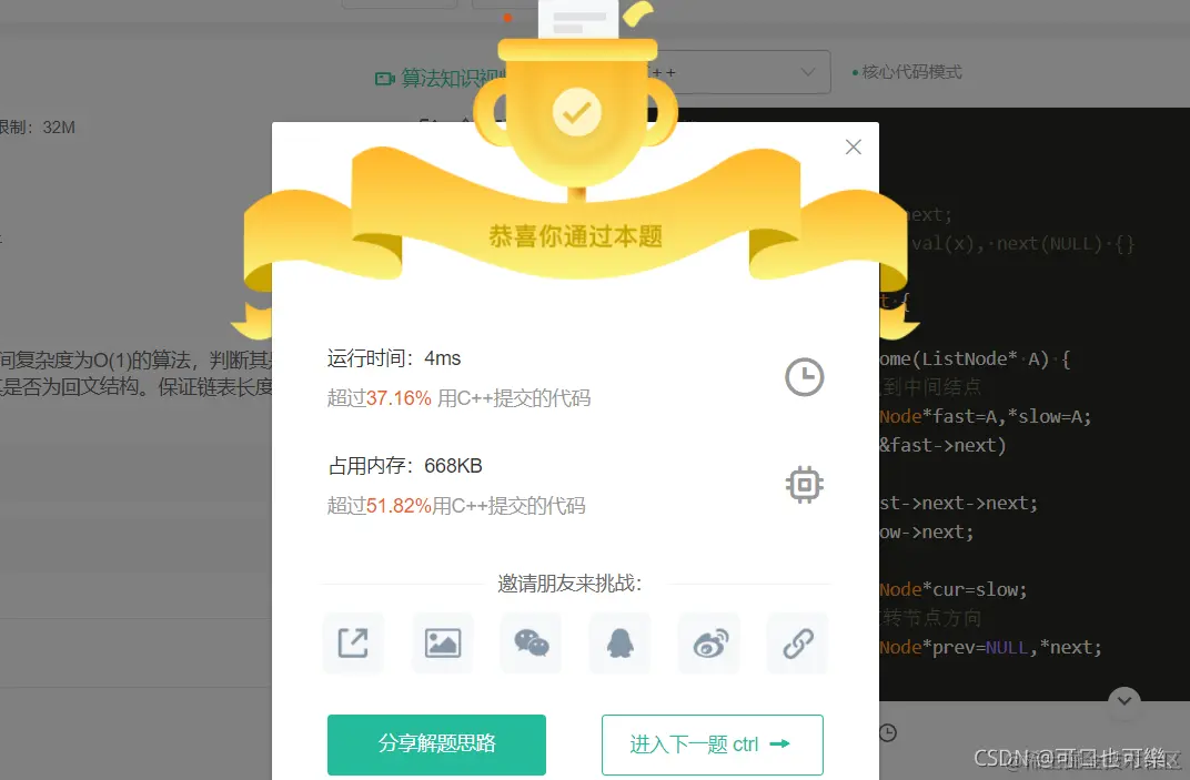 给定一个链表的头指针A,请返回一个bool值,代表其是否为回文结构。保证链表长度小于等于900。