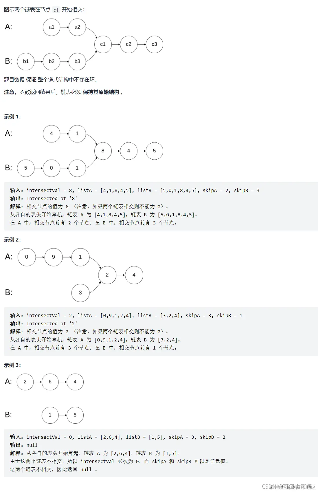 headA和headB,请你找出并返回两个单链表相交的起始节点。如果两个链表没有交点,返回null。