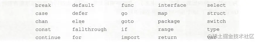 关键字是拥有特定语法含义的标识符、在Go语言中是一门极简的语言,只有如下25个关键字: