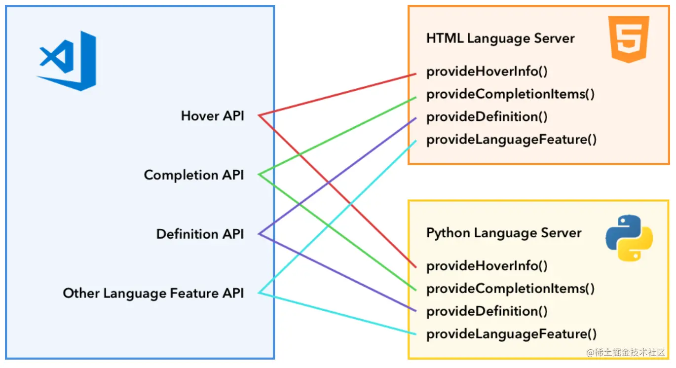 编程语言功能包括自动完成、错误检查和跳转到定义。这些特性通常由语言服务器(Language Server)提供,这是一个分析项目以提供动态特性的程序。一个例子就是VS Code中绑定的typescript-language-features扩展。原理如下图所示: