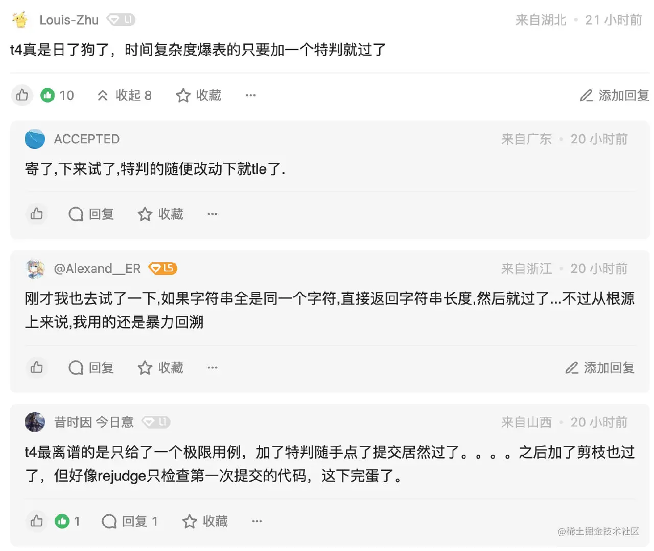 对于这一场比赛大家的反应都是第四题比较难,并且在比赛的时候通过的人数还非常多。还有同学扒出了最后一题的极端case只有一个,加上特判就能通过。