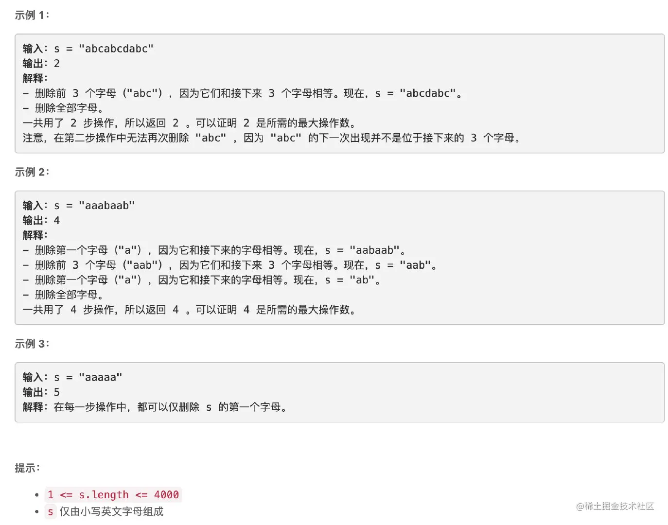 例如,如果 s = "ababc" ,那么在一步操作中,你可以删除 s 的前两个字母得到 "abc" ,因为 s 的前两个字母和接下来的两个字母都等于 "ab" 。