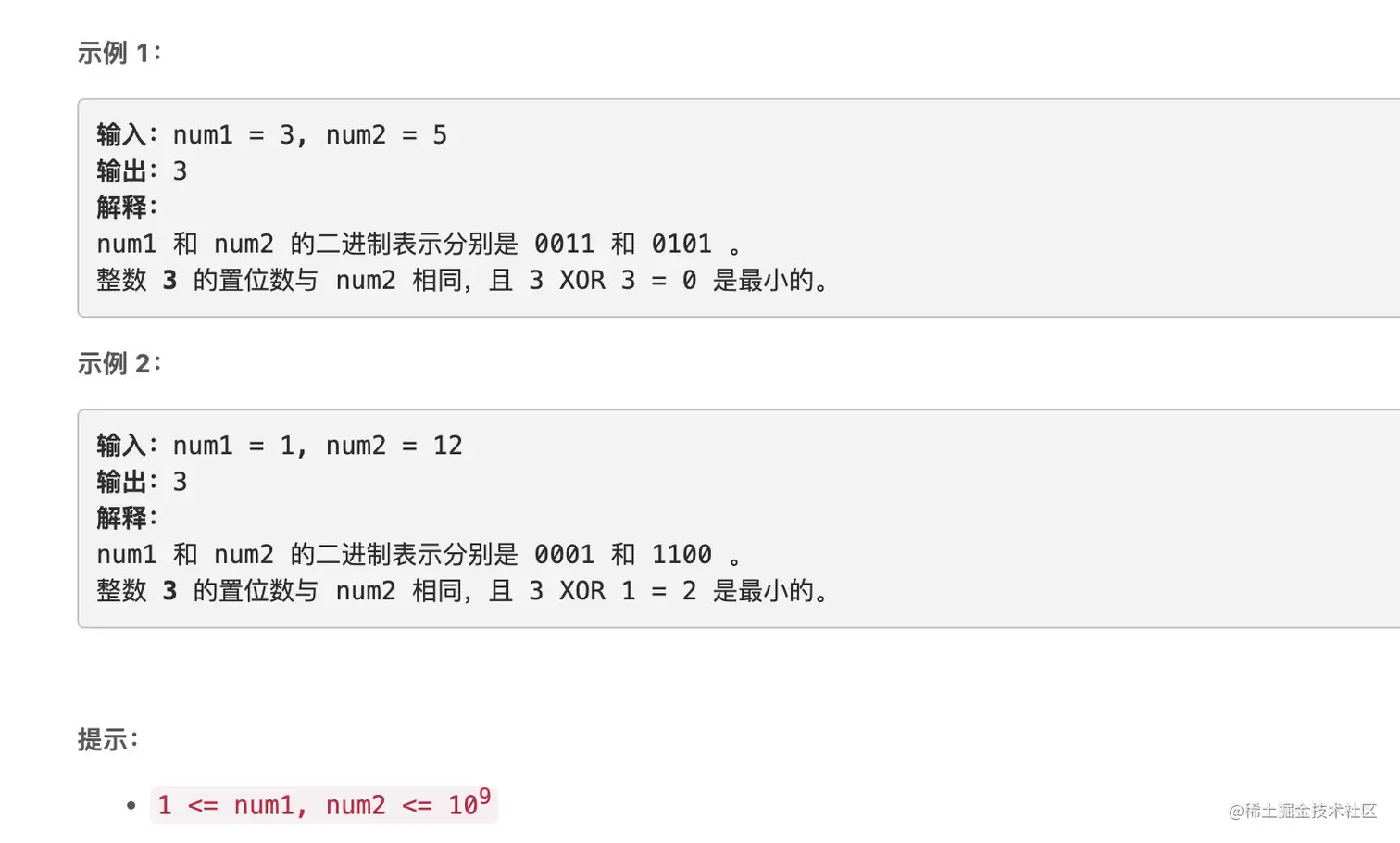 比较容易想到我们可以算出num2的置位数,然后枚举所有可能组成的整数,再找到和num1异或之后最小的一个,但很遗憾,这样做会超时。极端情况:一共有32个二进制位,如果num2的置位数是16,那么情况总数是,会超时。