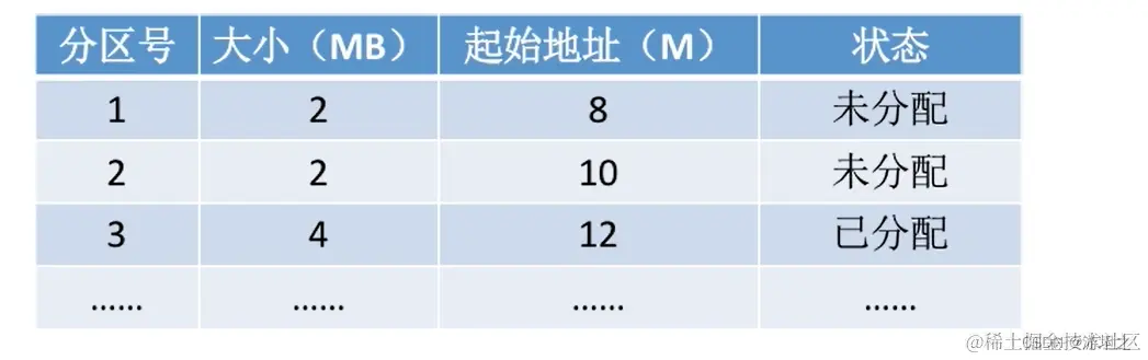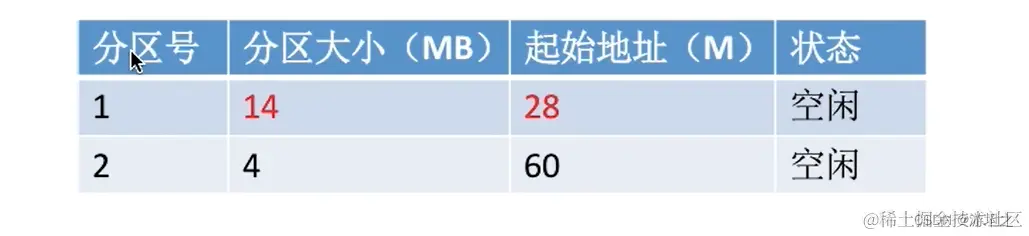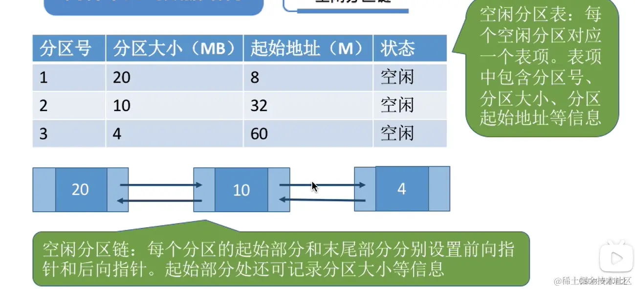 两种常用的数据结构:空闲分区表、空闲分区链(如下图)