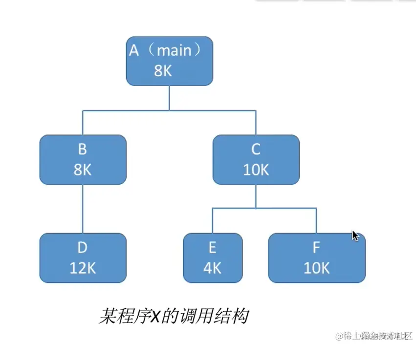 当采用覆盖技术存储时,则可根据层次结构,划分出一个固定区和两个覆盖区(A、B)。固定区的内存大小为8K。覆盖区A的内存大小为10K(因为在同一时间段内,B和C只能有一个运行,所以取其大者)。同理覆盖区B的内存大小为12K。由此可见,当采用覆盖技术时,只需要30K的内存,便可以运行这个程序。