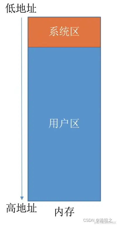 在单一连续分配方式中,内存被分为两个部分:系统区和用户区。(如下图)