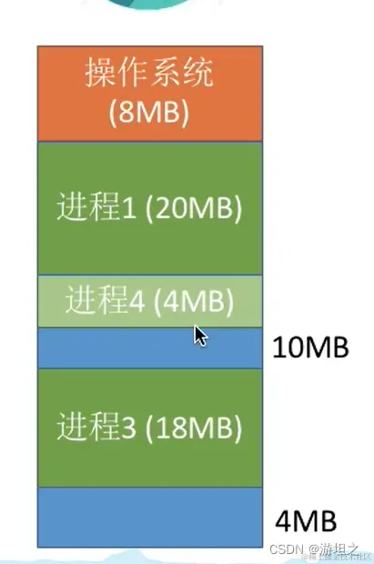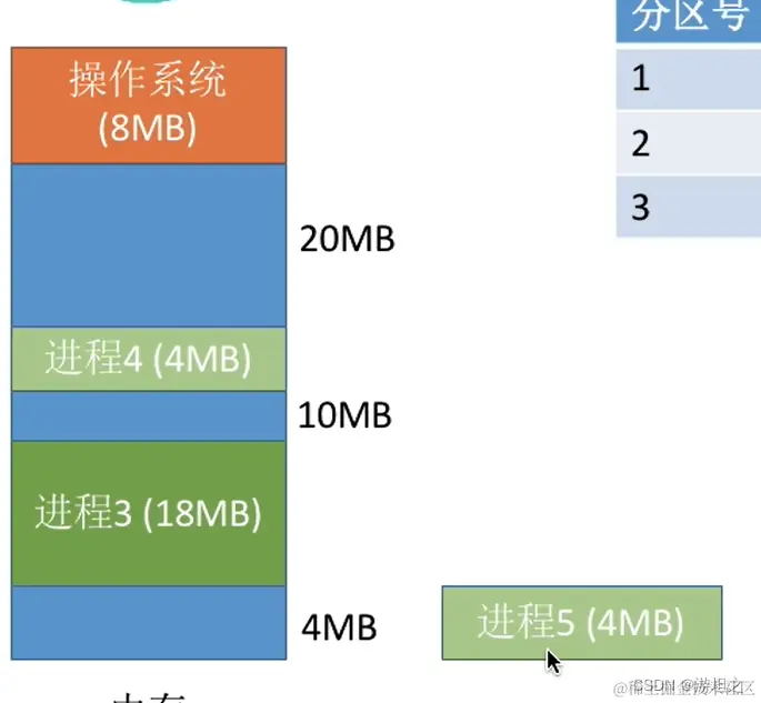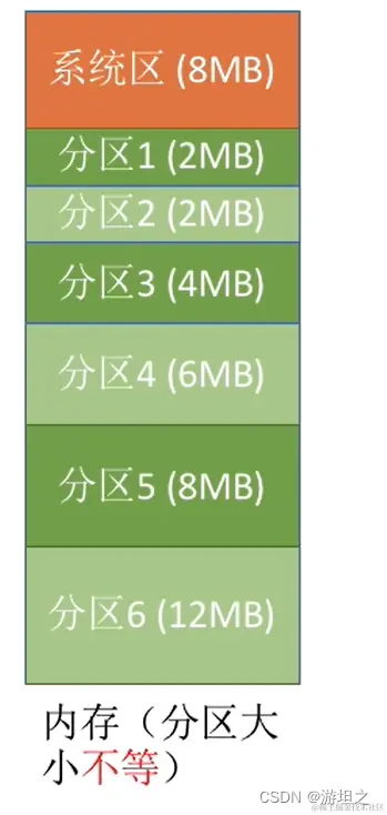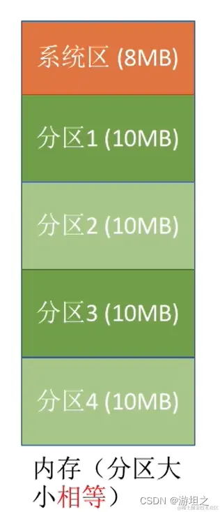 分区大小相等:如下图,即将用户区分成内存大小一致的多个分区。每个分区只能放一道作业。