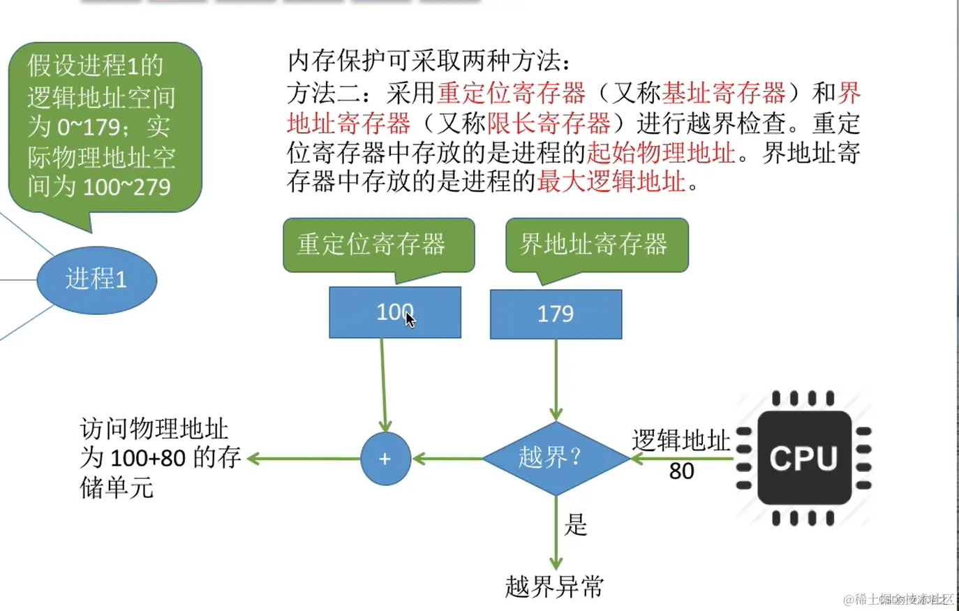 <2.界地址寄存器+重定位寄存器。其中重定位寄存器中存储的是物理地址的起始位置,界地址寄存器存放的是逻辑地址的最大位置。