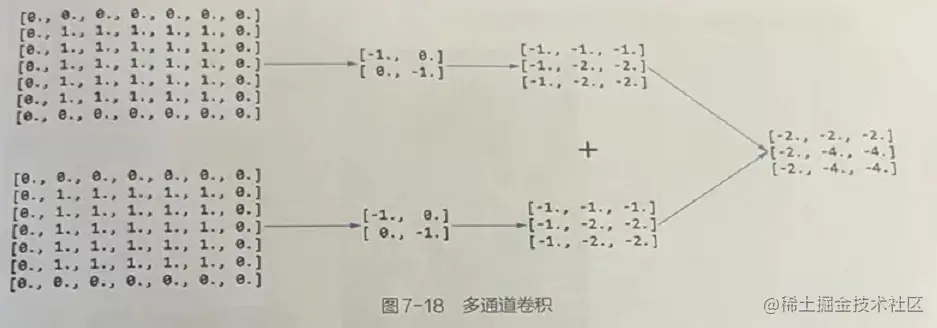 ## 2个通道输入,生成1个特征图(卷积核个数)====》对于卷积核对多通道输入的卷积处理,多通道的结果的叠加