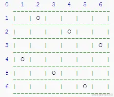 一个如下的 的跳棋棋盘,有六个棋子被放置在棋盘上,使得每行、每列有且只有一个,每条对角线(包括两条主对角线的所有平行线)上至多有一个棋子。