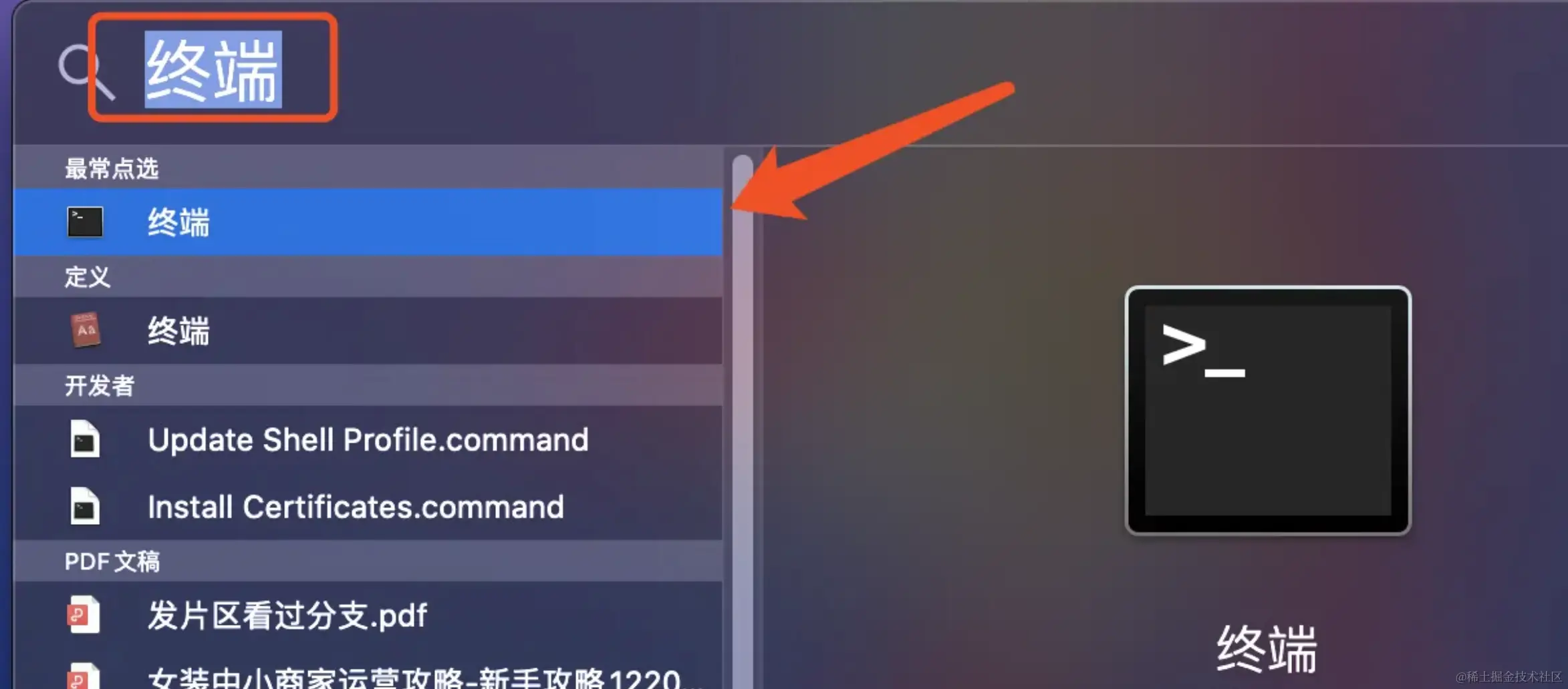 首先打开启动台,找到最上面的“搜索栏”输入“终端”,
