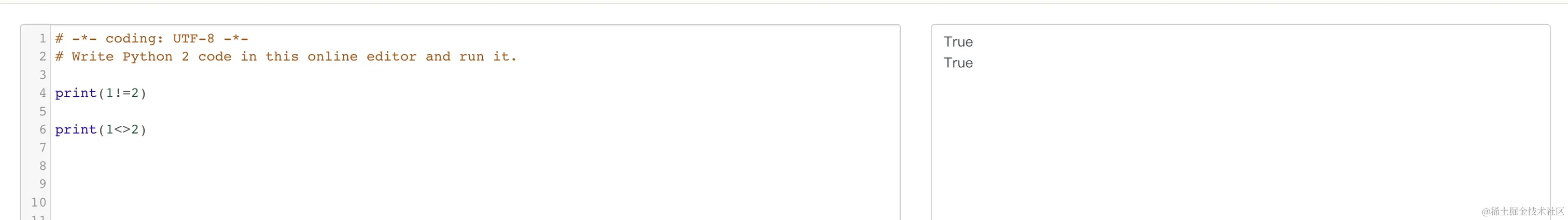 Python 2.x 中的不等于运算符有 2 种写法,分别为 != 和 <>,但在 Python 3.x 中去掉了 <>,只有 != 这一种写法,例如: