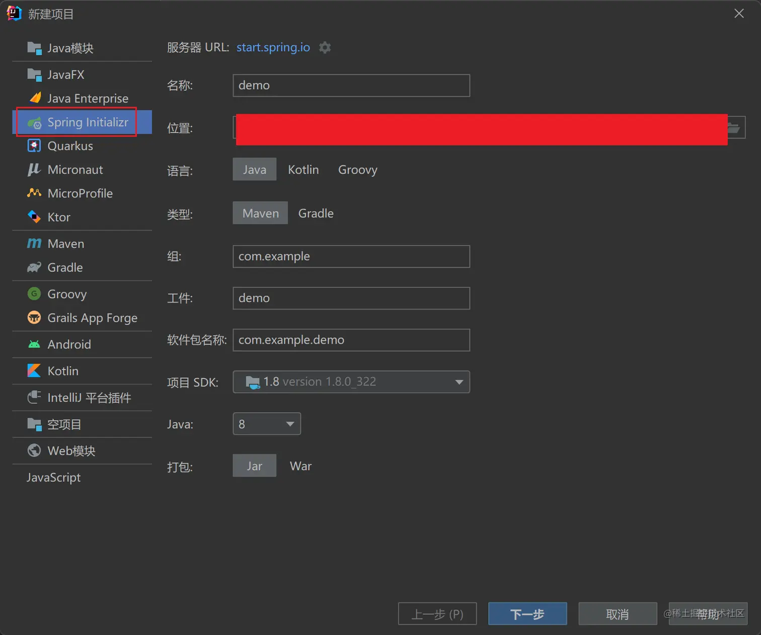 Spring Initializr指定项目名称、组、工件、软件包名称、Java版本、打包方式