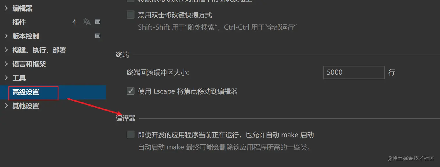 当你没有找到compiler.automake.allow.when.app.running时。可打开设置,通过高级设置(Advanced Settings)中的编译器(complier)中的选项勾选,然后重启项目即可。
