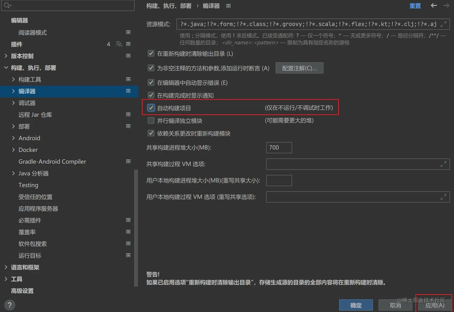 IDEA自动编译,在IDEA中的设置中进行配置,打开设置后,搜索输入compiler(编译器),打开勾选Bulid project automatically(自动构建项目),然后应用即可