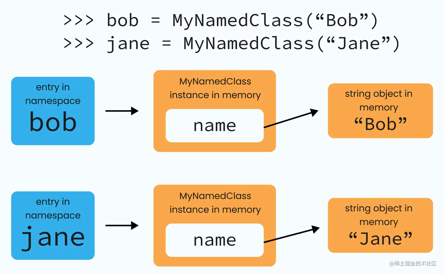 首先,我们创建两个对象,每个对象在命名空间中都有一个名字。