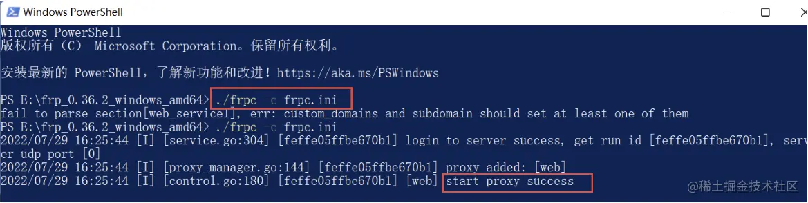 如果在启动后输出内容最后看到 Start frps success,那恭喜你,已经成功了一半