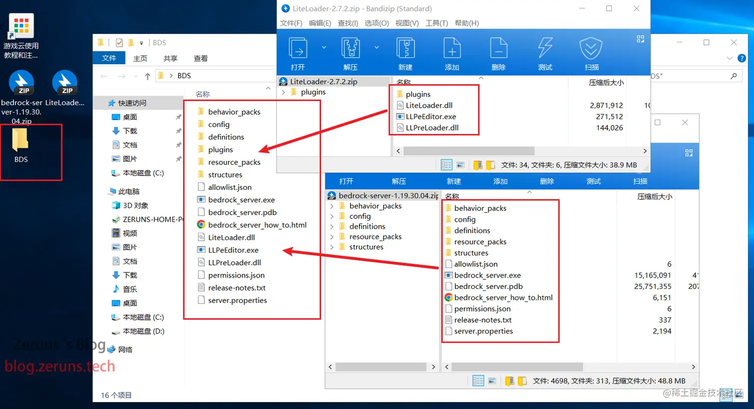 然后将下载的BDS服务端压缩包和LiteLoader压缩包拉到服务器上,然后在服务器上找地方创建一个文件夹用作服务端文件夹,文件夹名随意(不要用中文),然后将上面下载的两个压缩包里的文件都解压到这个目录。