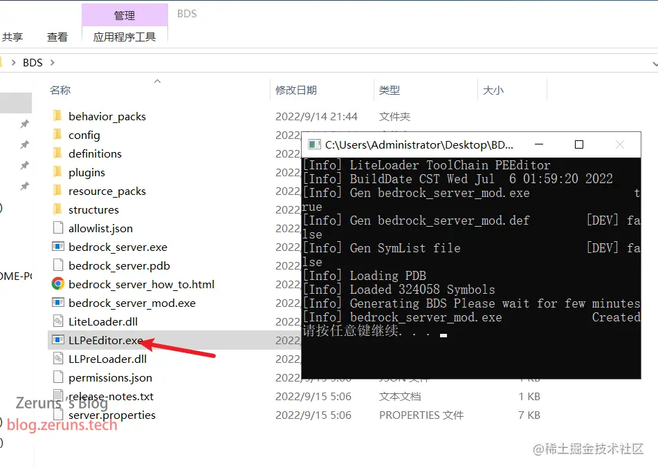 接着双击运行 LLPeEditor.exe 来生成具有导出符号的BDS(bedrock_server_mod.exe),当控制台输出 请按任意键继续. . . 时,按任意键关闭窗口。