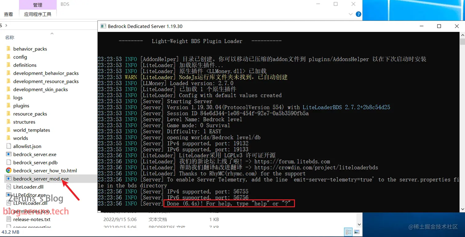 接着双击运行 bedrock_server_mod.exe 开服,等待控制台显示如下图所示字样表示开服完成。