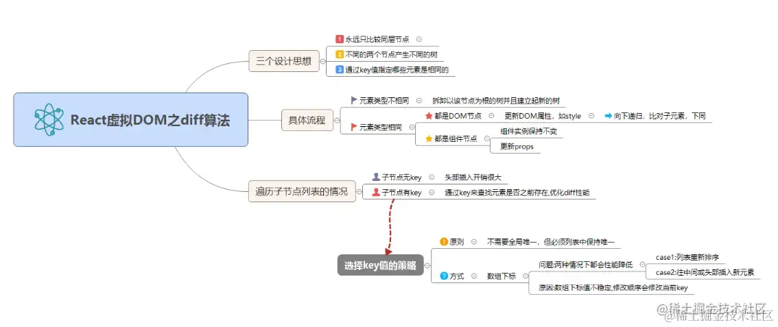 1.同级元素进行Diff。如果一个DOM节点在前后两次更新中跨越了层级,那么React不会尝试复用他。