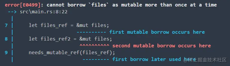 这个报错说这段代码是无效的,因为我们不能在同一时间多次将 s 作为可变变量借用。
