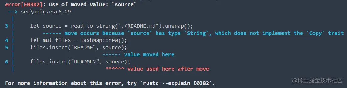 运行这段代码,会产生这个报错信息:use of moved value: source 。之后还会很多次看到它。