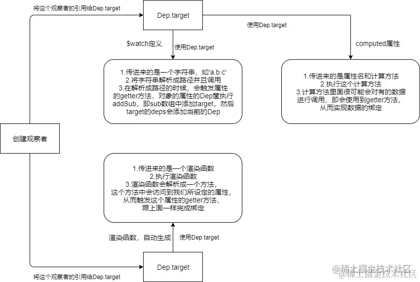 - Dep是负责存放数据所绑定所有的观察者的对象的容器,只要数据发生改变,就会通过这个Dep来通知所有观察者进行修改数据。(每个数据都有独一无二的Dep)。而Watcher更偏向于一个动作,也就是规定的业务逻辑或者渲染函数,是一个执行者。