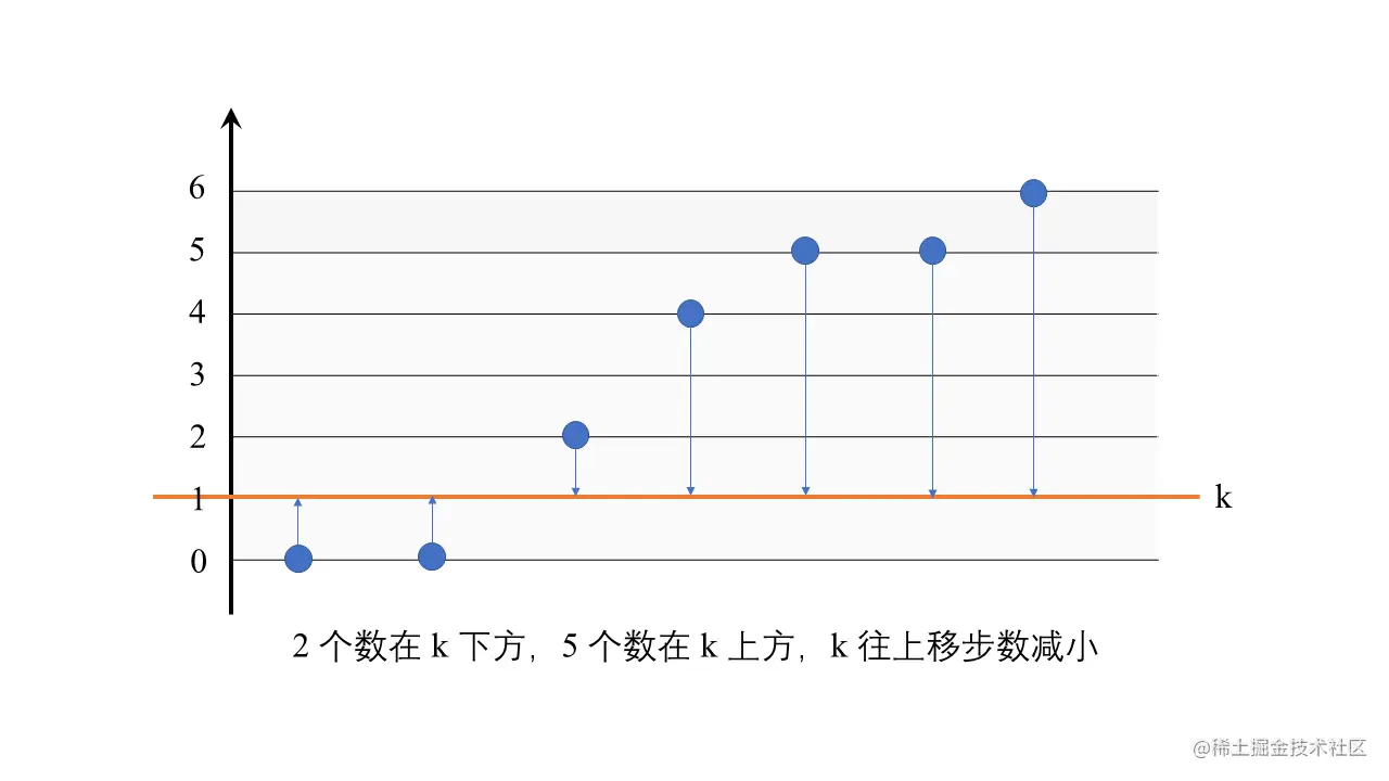 证明,假如我们此时有一个 nums ,k 表示我们要定的基准,比 k 小的数字有 m 个,比 k 大的个数有 n 个,假如此时我们的总的操作次数是 steps ,那么我们将 k 往上加一 ,此时我们的总的操作次数就是 steps + m - n ,很明显当 n 大于等于 m 的时候,能让 steps 变小,所以我们从最下面不断往上移动 k ,steps 可以一直减小,直到我们将 k 移动到 n 等于 m 的时候,我们 steps 此时最小,而这时候的 k 就是中位数。