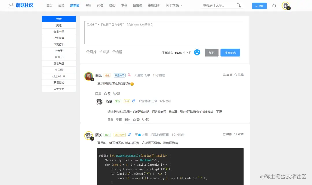细心的小伙伴可能会发现,最近蘑菇新上线了 IP 属地的功能,小伙伴在发表动态、发表评论以及聊天的时候,都会显示自己的 IP 属地信息