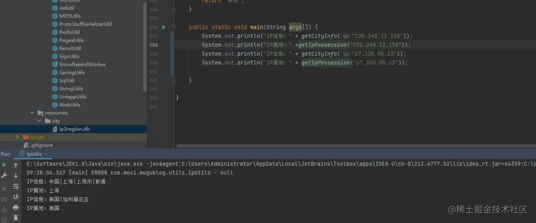 然后编写一个工具类 IpUtils ,首先需要加载 ip2region.db 文件