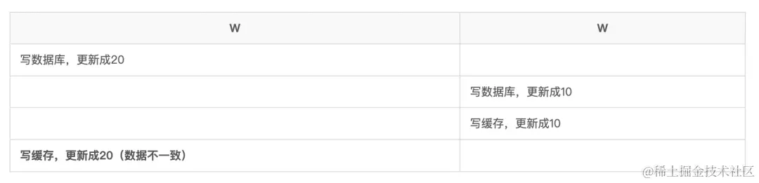 我们在《为什么会出现数据库和缓存不一致的问题》中介绍过的"写写并发"的场景中,如果同时更新缓存和数据库,那么很容易会出现因为并发的问题导致数据不一致的情况。如: