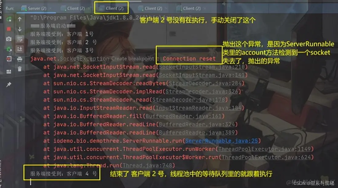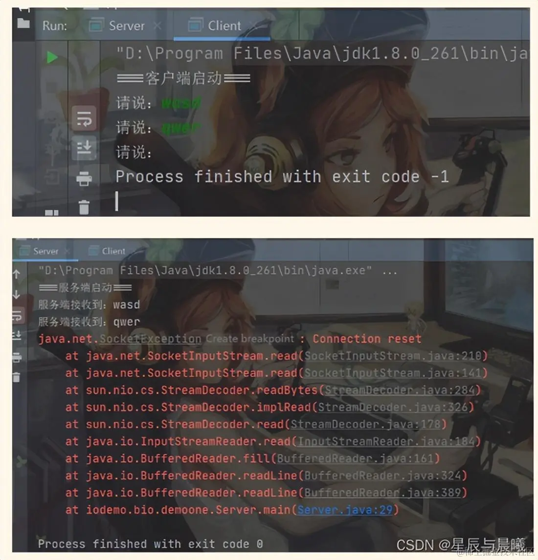 同时在这,若先关闭客户端,那么服务端就将会报错。Connection reset(连接重置的意思)
