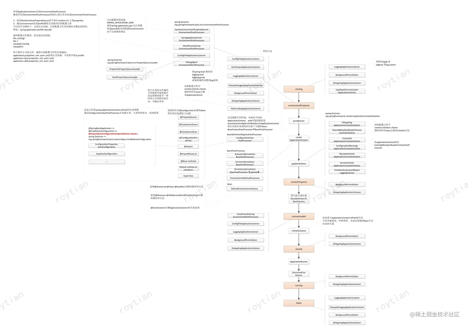 Spring boot会每个关键阶段发布对应的事件去触发listener参与spring boot的构建过程,整体的生命周期如下: