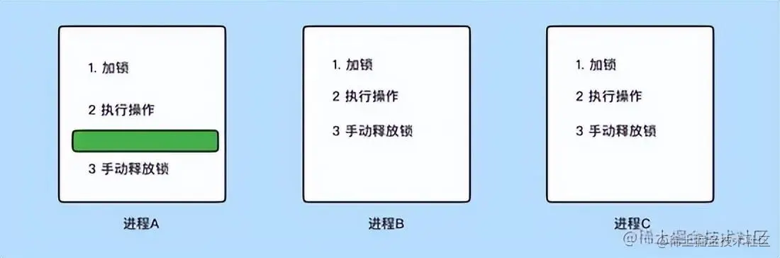 现在的情况是 进程A 执行第2步时卡顿了(上面绿色区域所示),且时间超出了锁有效期,所以 进程A 设置的锁自动释放了,这时候 进程B 获得了锁,并开始执行操作,但由于 进程A 只是卡顿了而已,所以会继续执行的时候,在第3步的时候会手动释放锁,但是这个时候,锁由 线程B 所拥有, 也就是说进程A删除的不是自己的锁,而进程B的锁 ,这时候 进程B 还没执行完,但锁被释放后, 进程C 可以加锁, 也就是说由于进程A卡顿释放错了锁,导致进程B和进程C可以同时获得锁 。