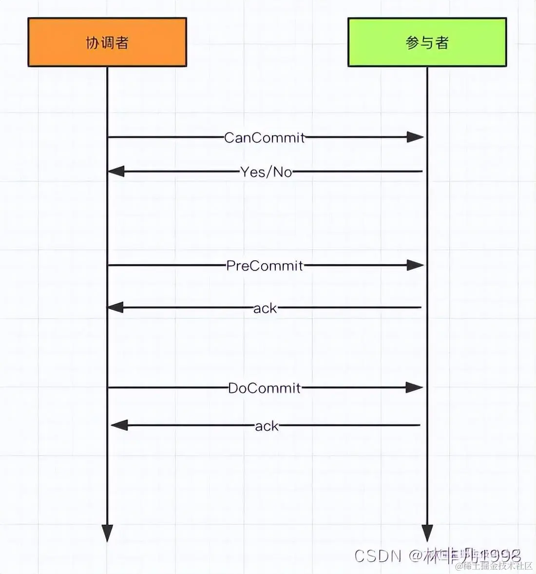 - PreCommit :协调者向所有参与者发送PreCommit命令,询问是否可以进行事务的预提交操作,参与者接收到PreCommit请求后,如参与者成功的执行了事务操作,则返回Yes响应,进入最终commit阶段。一旦参与者中有向协调者发送了No响应,或因网络造成超时,协调者没有接到参与者的响应,协调者向所有参与者发送abort请求,参与者接受abort命令执行事务的中断。