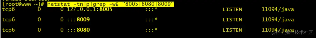 netstat -tnlp|grep -wE "8005|8080|8009"