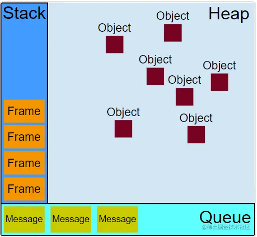 简单理解该图,queue是message队列,主线程从message队列中按顺序去除message并处理,处理过程中会创建栈帧,和堆对象。