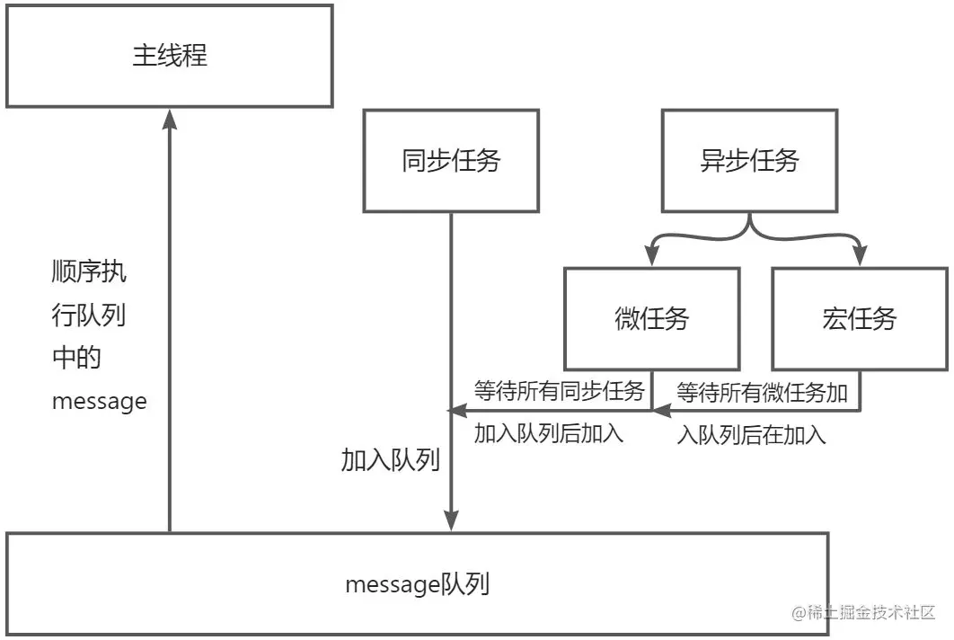 上面的图简述了所有的任务都会加入到message队列中,异步任务总是会让同步任务先,而异步任务中的宏任务总会让微任务先行。然后形成一个message队列,主线程按序执行。