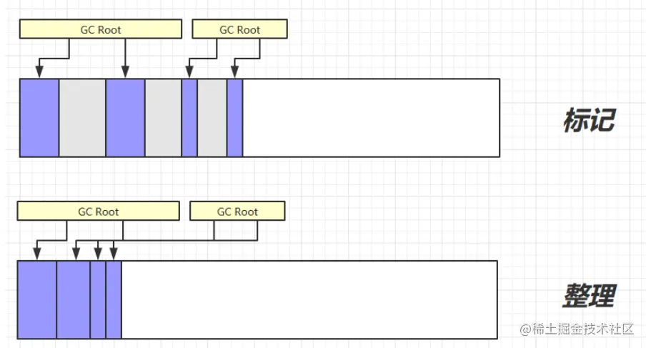 - 整体上是 标记+整理 算法,两个区域之间是 复制 算法