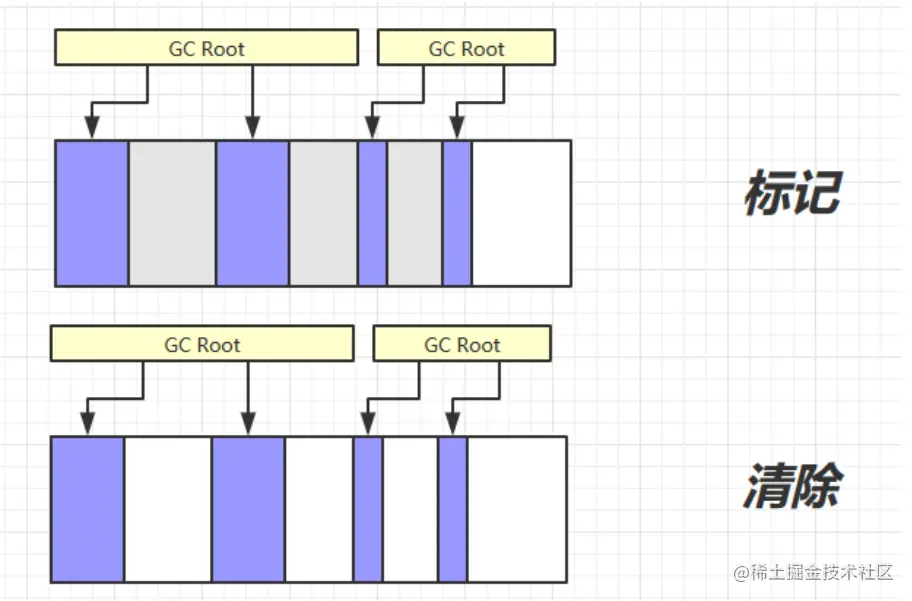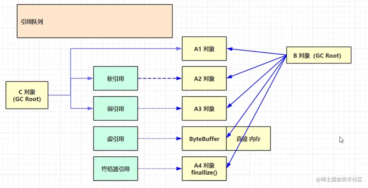 - 只有所有 GC Roots 对象都不通过【强引用】引用该对象,该对象才能被垃圾回收