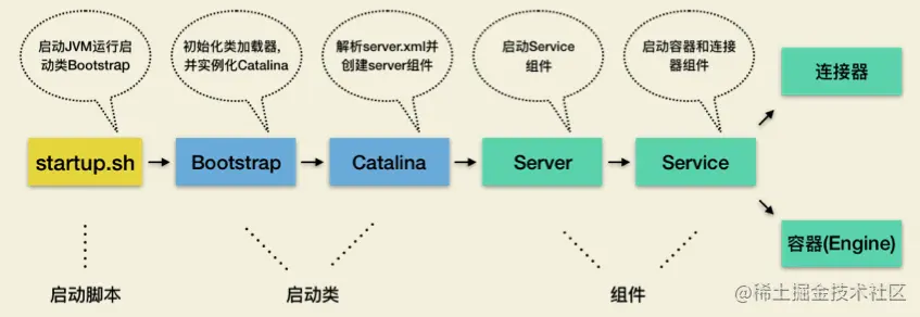 - Tomcat本质上也是一个Java程序,因此startup.sh脚本会启动一个JVM来运行Tomcat的启动类 Bootstrap